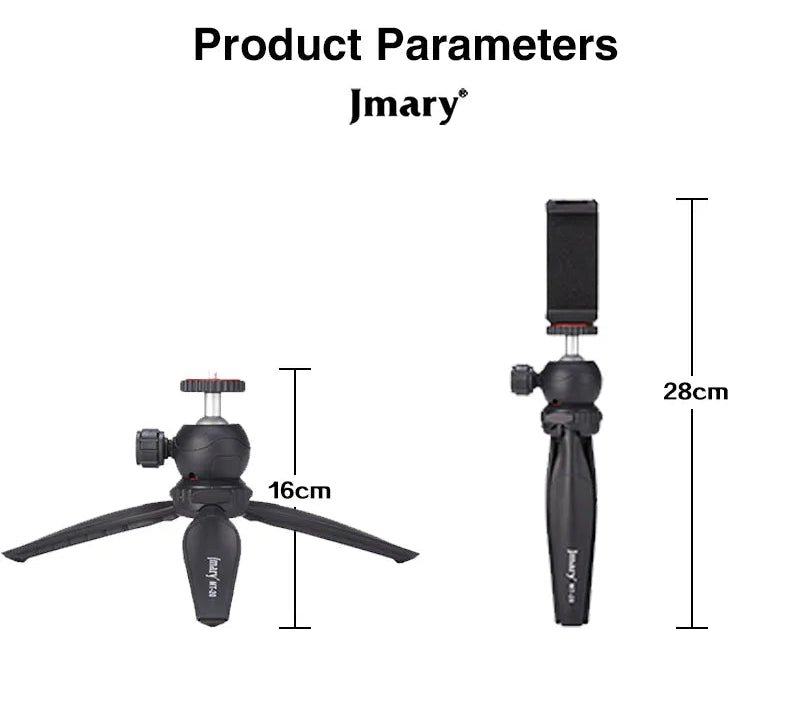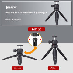 Le MT‑20 de Jmary est un trépied de table ultra‑compact, conçu pour stabiliser les appareils légers (smartphones, DSLR légers, caméras compactes) avec une base solide et une tête rotative à 360°.